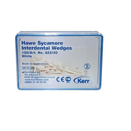 Färgkodade anatomiskt utformade interdentalkilar av sycamore trä. De konkava sidorna anpassar sig till den interdentala konturen. Den kvadratiska änden möjliggör enkel isättning av kilen och den uppåtvända spetsen förhindrar skador på papillerna. Vit, 13 mm, xx-fin.