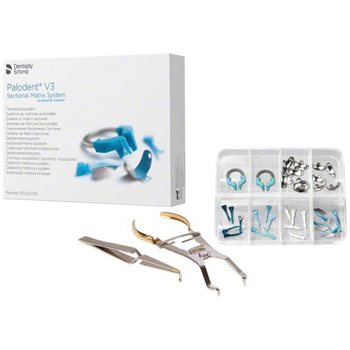 Kitet innehåller: 20 matriser, 15 kilar, 5 wedgeguards, 2 universal ringar, 1 tång, 1 pincett