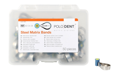 Dubbelkonturerade anatomiskt formade matrisband, vinklade för enkel anpassning. Stabila och konstruerade för att förhindra glidning. Rostfritt stål.