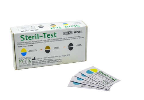 Steril-Test 6 är en tvåfasindikator för 121°C och 134°C cykler. Den första indikatorn växlar från ljusblå till svart och den andra från gul till svart, när steriliseringsförhållandena är rätt. Steriltest 6-indikatorn är helt laminerad.