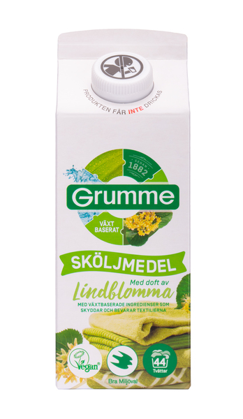 Grummes sköljmedel kommer i en CO2-neutral och praktisk kartongförpackning och är miljömärkt med Bra miljöval.