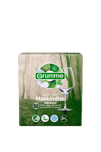 Grumme Maskingdisktabletter är ett allt-i-ett maskindiskmedel med diskkraft och glansmedel i samma tablett. Den tar effektivt bort fett, fläckar och matrester och ger disken en skinande och fräsch yta.