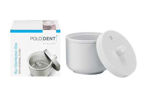 Desinfektionsbox för runda borrspetsar med lock och avrinningskorg. Lämplig för blötläggningsdesinfektion av små roterande instrument. Ej lämplig i termisk desinfiserare men autoklaverbar upp till 140 °C. Passar även för rengöring/blötläggning av proteser.