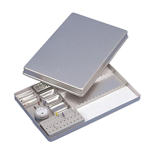 Innehåller: 1 st Bricka med lock (grå aluminium), 1 st Instrumentram, 1 st Ställ för rymmare, 1 st Pelletsask, 1 st Borrask, 1 st Clean-Grip, 1 st Pointsask, 1 st Medikamentskål. Storlek Bricka: 184x140x17 mm. Storlek Bricka + Lock: 185x145x39 mm.
