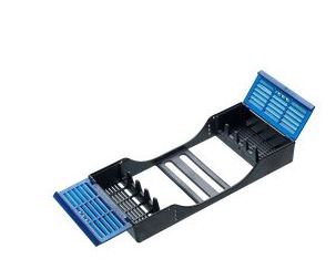 Hygienisk instrumentkassett i patenterad design för 5 st instrument, utvecklad för en effektiv och säker hantering vid sterilisering och organisering av instrument. Svart bricka i autoklaverbar plast med skyddande färgkodade säkerhetsbyglar för att undvika stick- och skärskador samt att den skyddar instrumentens spetsar vid rengöring. Mått: 180x83x26 mm. Färgkod: Blå.