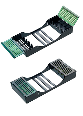 Hygienisk instrumentkassett i patenterad design för 5 st instrument, utvecklad för en effektiv och säker hantering vid sterilisering och organisering av instrument. Svart bricka i autoklaverbar plast med skyddande färgkodade säkerhetsbyglar för att undvika stick- och skärskador samt att den skyddar instrumentens spetsar vid rengöring. Mått: 180x83x26 mm. Färgkod: Grön.