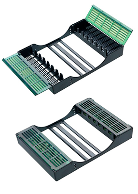 Hygienisk instrumentkassett i patenterad design för 8 st instrument, utvecklad för en effektiv och säker hantering vid sterilisering och organisering av instrument. Svart bricka i autoklaverbar plast med skyddande färgkodade säkerhetsbyglar för att undvika stick- och skärskador samt att den skyddar instrumentens spetsar vid rengöring. Mått: 180x133x26 mm. Färgkod: Grön.