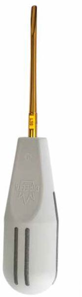 Luxator periotom av rostfritt stål med titanbeläggning som är speciellt designat med ett fint avsmalnande blad som komprimerar det alveolära benet, skär membranet och varsamt lossar tanden med minimal skada på vävnaden. Titanbeläggningen minskar friktionen och glider lätt. Behåller skärpan och behöver ej slipas. Ergonomiskt vitt handtag med färgkod grå med rak arbetsdel 3 mm. Levereras med skyddsbehållare Fixus.
