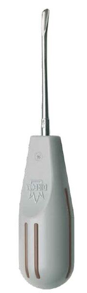 Periotom- ett extraktionsinstrument utformat för luxation av tänder. Instrumentet skär av de periodontala ligamenten och komprimerar det omgivande alveolära benet samt lossar tanden med ett minimum av skada på vävnaden. Periotom används i tandens axiala riktning. Grått ergonomiskt handtag med färgkod. Levereras med Fixus skyddsbehållare. Böjd 5 mm, färgkod - brun.