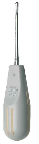 Periotom- ett extraktionsinstrument utformat för luxation av tänder. Instrumentet skär av de periodontala ligamenten och komprimerar det omgivande alveolära benet samt lossar tanden med ett minimum av skada på vävnaden. Grått ergonomiskt handtag med färgkod. Levereras med Fixus skyddsbehållare. Rak 5 mm, färgkod - ljusbrun.
