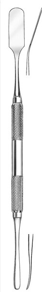 Dubbeländat raspatorie med en stor flat vinklad ände för att hålla lambån och en smalare avrundad skärande ände. Av rostfritt stål.