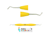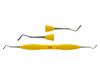 Dubbeländat kompositinstrument (burnisher) med droppformade arbetsändar för att forma och jämna ut ojämna marginaler och kanter vid restauration av tandfyllnadsmaterial. Ergonomiskt gult silikonhandtag, Ø 12 mm.