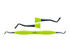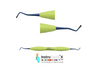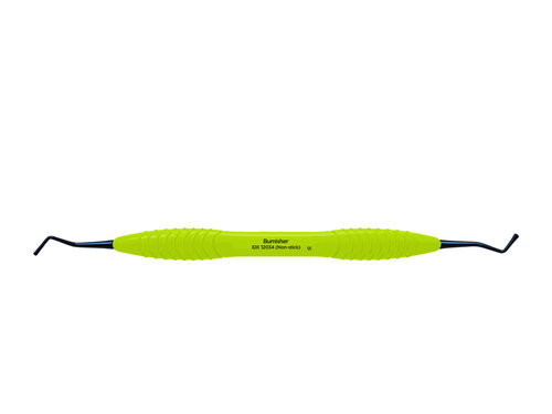 Dubbeländat kompositinstrument (burnisher) med "non-stick" titanium oxid beläggning. Droppformade arbetsändar för att forma och jämna ut ojämna marginaler och kanter vid restauration av tandfyllnadsmaterial. Den mörka beläggningen ger kontrast mot tandfyllningen. Ergonomiskt ljusgrönt (lime) silikonhandtag, Ø 12 mm.