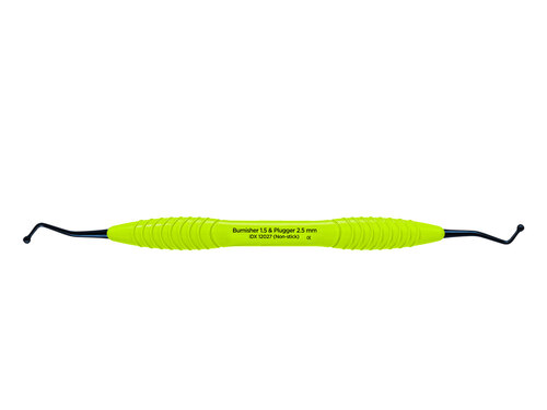Titanium oxid belagd kulstoppare/punsare med runda arbetsdelar 1,5-2,5 mm som är reptålig och klibbar ej till komposit. För att kondensera och forma tandfyllnadsmaterial . Ergonomiskt ljusgrönt (lime) silikonhandtag, Ø 12 mm.