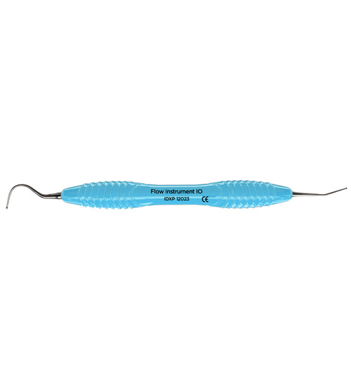 Dubbeländat kondenseringsinstrument av rostfritt stål för placera och forma flytande kompositer. Ergonomiskt blått silikonhandtag Ø 13,5 mm.