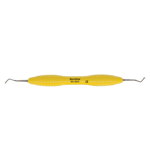 Dubbeländat kompositinstrument (burnisher) med droppformade arbetsändar för att forma och jämna ut ojämna marginaler och kanter vid restauration av tandfyllnadsmaterial. Ergonomiskt gult silikonhandtag, Ø 13,5 mm.