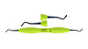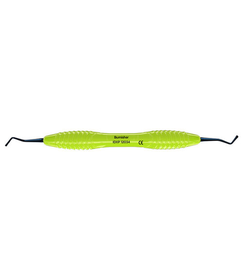 Dubbeländat kompositinstrument (burnisher) med "non-stick" titanium oxid beläggning. Droppformade arbetsändar för att forma och jämna ut ojämna marginaler och kanter vid restauration av tandfyllnadsmaterial. Den mörka beläggningen ger kontrast mot tandfyllningen. Ergonomiskt ljusgrönt (lime) silikonhandtag, Ø 13,5 mm.
