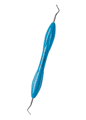 Dubbeländat instrument för att packa retraktionstråd i den gingival tandfickan. Instrumentet har ett böjt blad vilket gör att man ta sig runt tanden och packa tråden med vertikala rörelser, 2,0 mm. Blått silikonskaft ErgoSense - 13,7 mm.