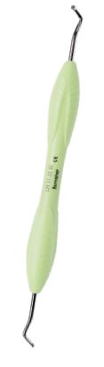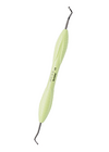Dubbeländat instrument med päronformade arbetsdelar för att punsa, modellerera och finishera tandfyllningar.