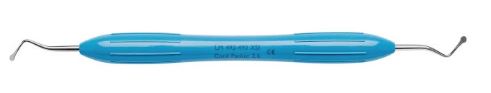 Dubbeländat instrument för att packa retraktionstråd i den gingival tandfickan. Instrumentet har ett böjt blad vilket gör att man ta sig runt tanden och packa tråden med vertikala rörelser, 2,6 mm. Blått silikonskaft ErgoMax - 11,5 mm.