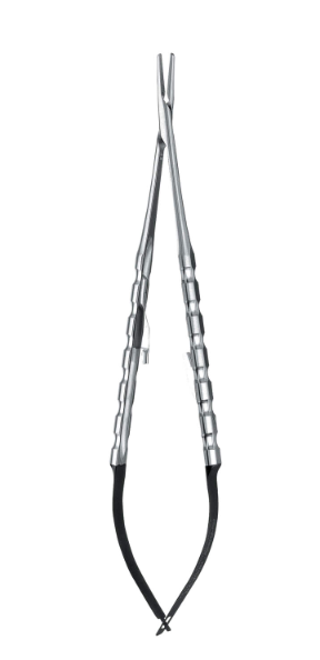 Mikrokirurgisk nålhållare med lås som säkerställer att nålen sitter ordentligt. Detta gör att nålen kan styras genom grovt tandkött med kontrollerat grepptryck.