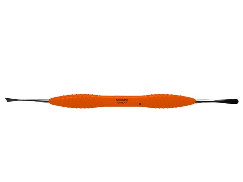 Dubbeländat raspatorium enligt Glickmann av rostfritt stål med skärande egg i båda ändar. Ergonomiskt oranget silikonhandtag, Ø 12 mm.