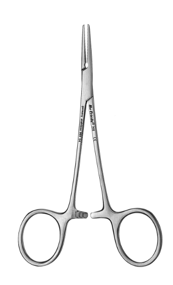 Multifunktionellt instrument med rak, Halsted-formad näbb som används för att klämma fast blodkärl, ta bort små rotspetsar och gripa lösa föremål.