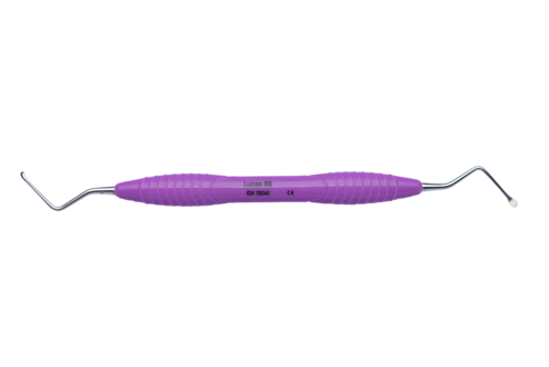 Dubbeländad skedformad ben curette som enkelt gör att man kan byta arbetssida. Arbetsdel 2,5 mm. För att skrapa och avlägsna överbliven mjukvävnad. Ergonomiskt lila silikonhandtag, Ø 12 mm.