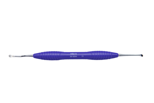 Dubbeländad bencurette med handtag av silikon som är designad för borttagning av debris alveolärt vid extraktion, borttagning av cystor och curettage. Arbetsdelar 3,4 mm. Designad för lättare åtkomst posteriort. Ergonomiskt lila silikonhandtag, Ø 12 mm.