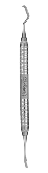 Den 7 mm böjda bakre delen av Urban Chisel används för benborttagning, medan den raka 7 mm breda änden används för att mäta avståndet mellan implantat med standarddiameter.