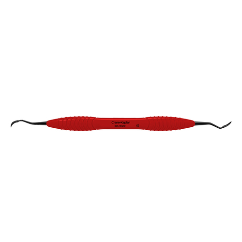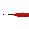Dubbeländad scaler med styva kraftigt böjda arbetsdelar. För borttagning av grov supragingival tandsten. Ergonomiskt rött silikonhandtag, Ø 12 mm.
