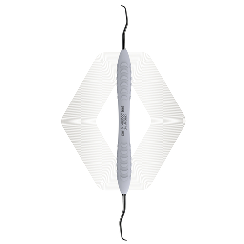 Dubbeländad slipfri finisheringscurette med belagda svarta arbetsdelar och ergonomiskt silikongrepp.
