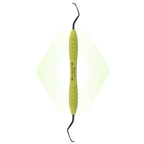 Dubbeländad slipfri finisheringscurette med belagda svarta arbetsdelar och ergonomiskt silikongrepp.
