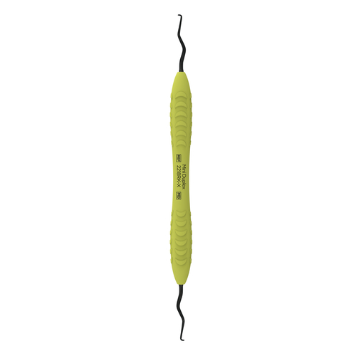 Dubbeländad slipfri universalcurette/finisheringscurette med belagda svarta arbetsdelar och ergonomiskt silikongrepp.