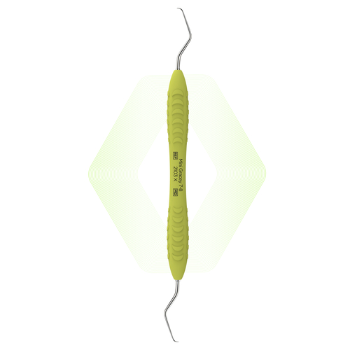 Dubbeländad finisheringscurette med ergonomiskt silikongrepp.