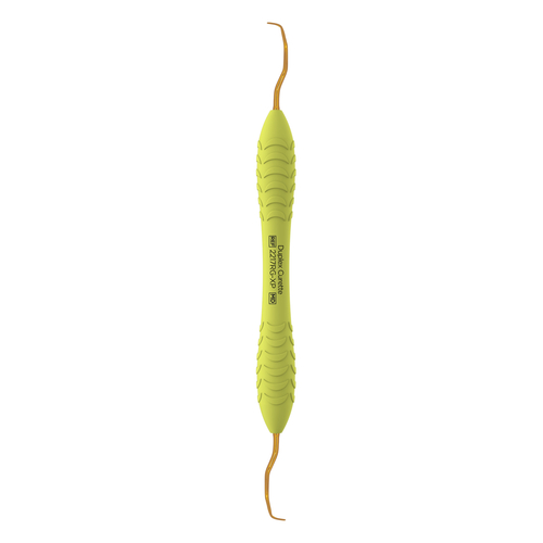 Dubbeländad slipfri universalcurette/finisheringscurette med belagda guldfärgade arbetsdelar och ergonomiskt silikongrepp.