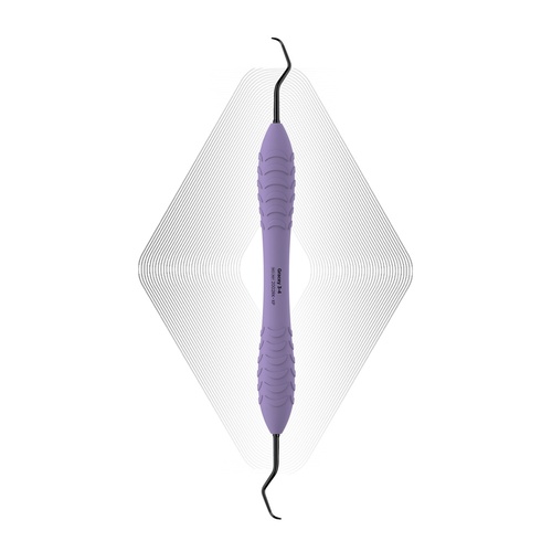 Dubbeländad slipfri finisheringscurette med belagda svarta arbetsdelar och ergonomiskt silikongrepp.
