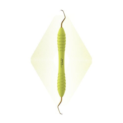 Dubbeländad slipfri finisheringscurette med belagda guldfärgade arbetsdelar och ergonomiskt silikongrepp.