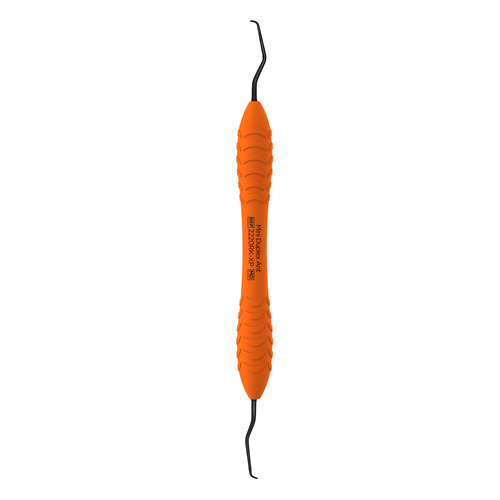 Dubbeländad slipfri universalcurette/finisheringscurette med belagda svarta arbetsdelar och ergonomiskt silikongrepp.
