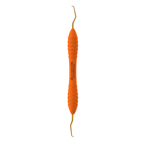 Dubbeländad slipfri universalcurette/finisheringscurette med belagda guldfärgade arbetsdelar och ergonomiskt silikongrepp.