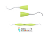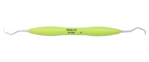 Dubbeländad finisheringscurette av rostfritt stål för avlägsnande av djup subgingival tandsten och finishering av subgingivala rotytor på premolarer och molarer. Ergonomiskt ljusgrönt silikonhandtag, Ø 12 mm.