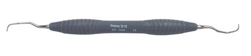 Dubbeländad finisheringscurette av rostfritt stål för avlägsnande av djup subgingival tandsten och finishering av subgingivala rotytor på mesialytor och distalytor hos molarer. Användbar vi arbete med en kvadrant i taget. Ergonomiskt grått silikonhandtag, Ø 12 mm.