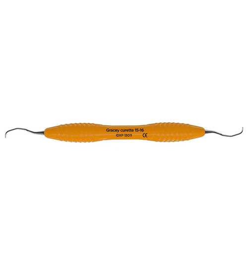 Curette av rostfritt stål för avlägsnande av djup subgingival tandsten och finishering av subgingivala rotytor på mesialytor hos molarer, mer vinklad i halsen än Gracey 11-12. Skaftet hålls då mer horisontalt vilket underlättar arbetet bl.a. om patienten inte kan öppna munnen tillräckligt. Ergonomiskt gult silikonhandtag, Ø 13,5 mm.