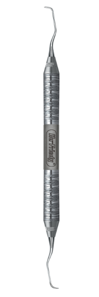 Styv (rigid) dubbeländad Gracey-kyrett. Vinklad för att nå de mesiala ytorna på de posteriora tänderna.