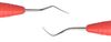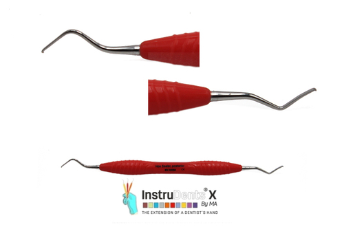 Dubbeländad posterior hake för att avlägsna supragingival marginal tandsten. Används på mesiala och distala ytor ytor på molarer, även för furkationer. Ergonomiskt rött silikonhandtag, Ø 12 mm.