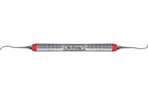 En sickel i satin steel handtag för det posteriora bettet, med kontravinkeldesign för att komma åt svåråtkomliga distala ytor.