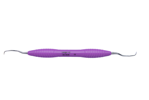 Dubbeländad universalcurett för avlägsnande av supragingival och subgingival tandsten. Langer kombinerar Gracey curettens halsböjning med universalcurettens arbetsdel. För premolarer och molarer i underkäken. Ergonomiskt lila silikonhandtag, Ø 12 mm.