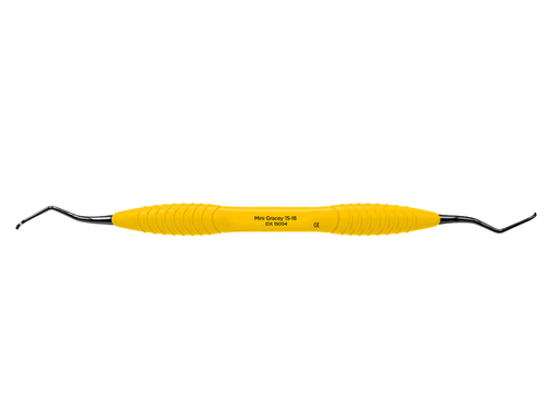 Curette för avlägsnande av djup subgingival tandsten och finishering av subgingivala rotytor på mesialytor hos molarer, mer vinklad i halsen än Gracey Mini 11-12. Skaftet hålls då mer horisontalt vilket underlättar arbetet bl.a. om patienten inte kan öppna munnen tillräckligt. Ergonomiskt gult silikonhandtag, Ø 12 mm.