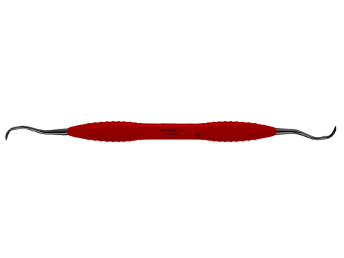 Dubbeländad mini sickel för avlägsnande av supragingival tandsten. För alla tandytor, speciellt approximalytor. Även för att ta bort överskott av cement och fyllning samt för att ta bort granlulationsvävnad och tandsten vid flap operation. Ergonomiskt rött silikonhandtag, Ø 12 mm.