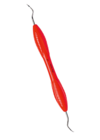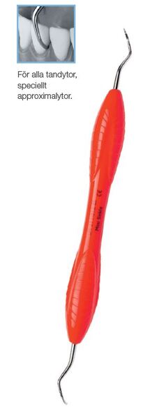 Dubbeländad gracil minisickel med svagt böjda arbetsdelar för avlägsnande av supragingival tandsten.